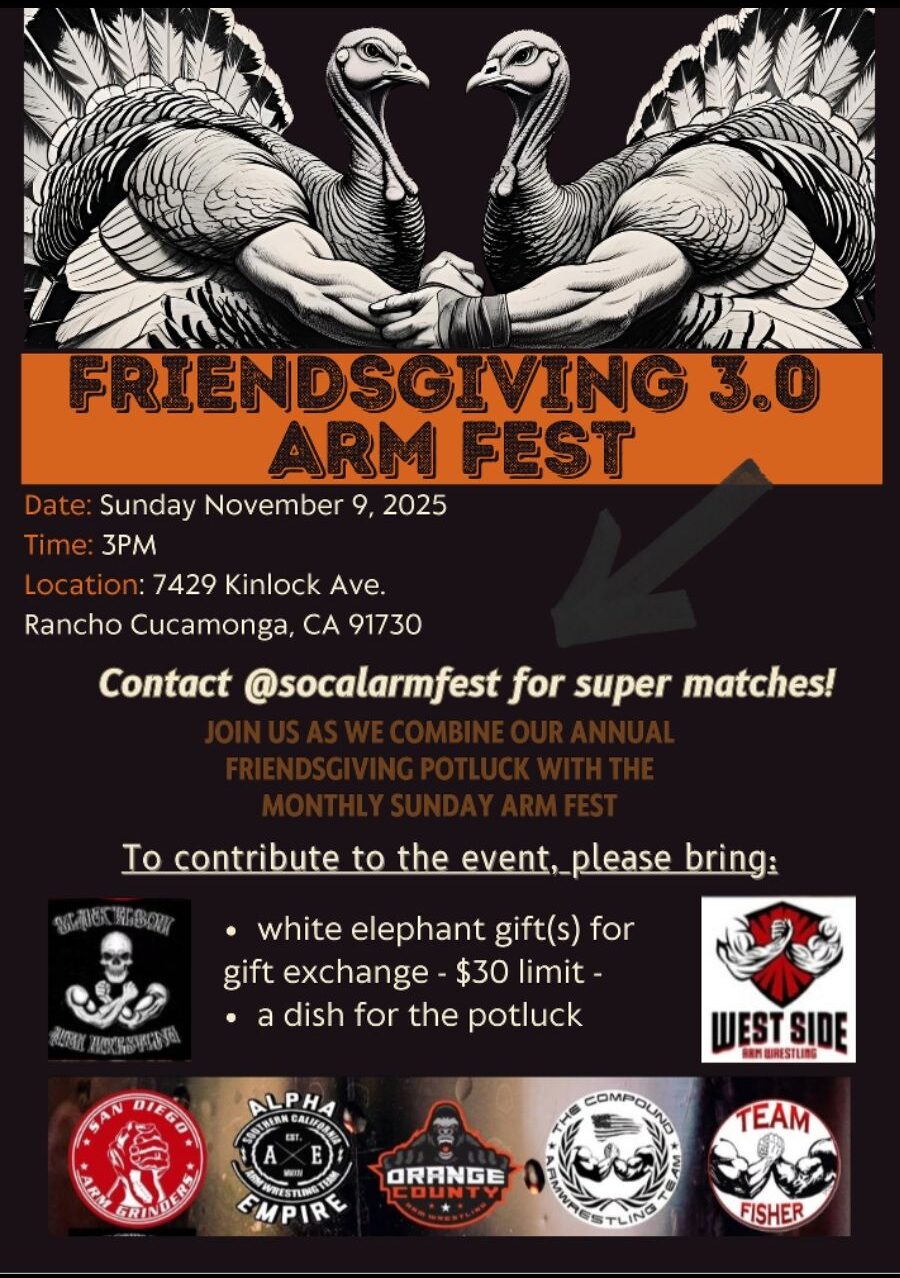 (CA) Friendsgiving 3.0 Arm Fest 00 days 00 hours 00 minutes 00 seconds Date Nov 09 2025 Time 3:00 pm - 6:00 pm Local Time Timezone: America/Los_Angeles Date: Nov 09 2025 Time: 1:00 pm - 4:00 pm State California Share this event