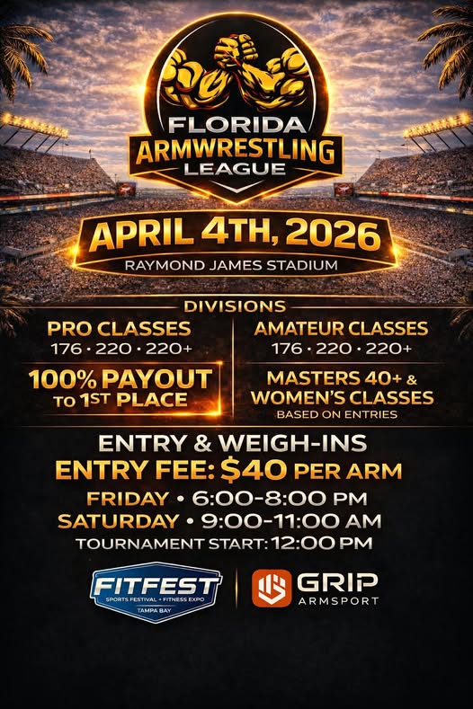 (FL) Florida Armwrestling League 00 days 00 hours 00 minutes 00 seconds Date Apr 04 2026 Time 12:00 pm - 6:00 pm Local Time Timezone: America/New_York Date: Apr 04 2026 Time: 1:00 pm - 7:00 pm Cost $40.00 State Florida Venue Raymond James Stadium 4201 North Dale Mabry Highway Highlights Cash Event Ladies Divisions Available Masters Divisions Available Promoter Chance Shaw Share this event