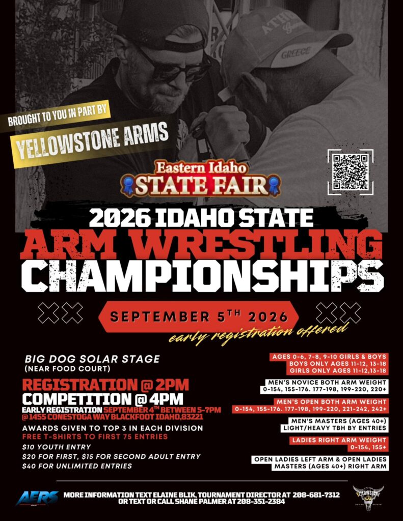 (ID) Idaho State Championships 00 days 00 hours 00 minutes 00 seconds Date Sep 05 2026 Time 4:00 pm - 9:00 pm Local Time Timezone: Europe/Berlin Date: Sep 05 - 06 2026 Time: 11:00 pm - 4:00 am Cost $20.00 State Idaho Highlights Kids Divisions Available Ladies Divisions Available Masters Divisions Available Submits to AERS Promoter Shane Palmer Phone 208-351-2384 Email yellowstonearms@gmail.com Share this event