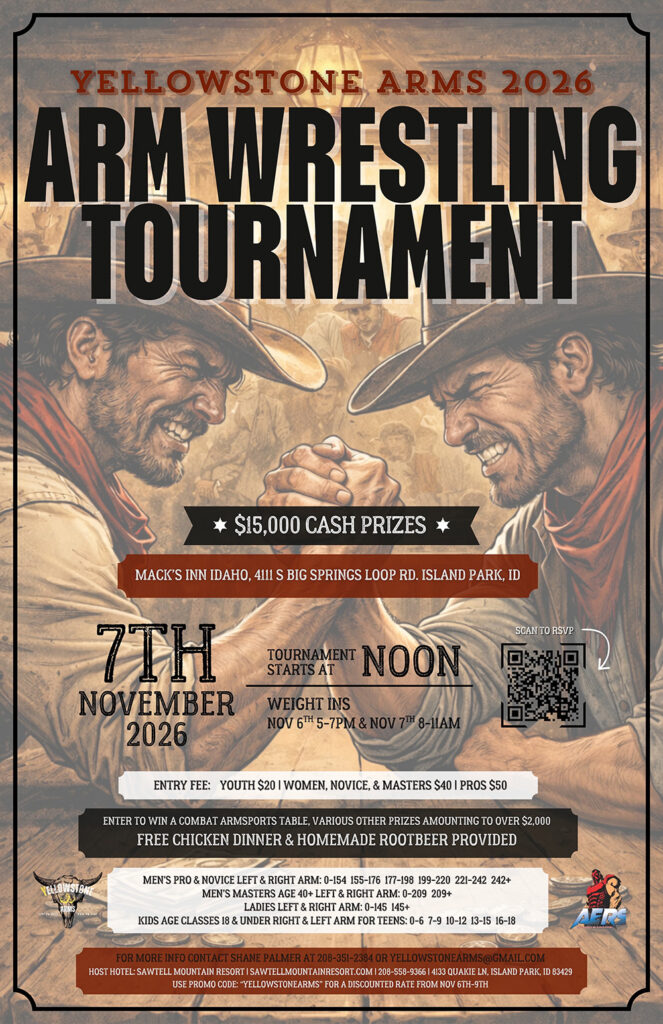 (ID) Yellowstone Arms 2026 00 days 00 hours 00 minutes 00 seconds Date Nov 07 2026 Time 12:00 pm - 6:00 pm Local Time Timezone: America/Anchorage Date: Nov 07 2026 Time: 9:00 am - 3:00 pm Cost $50.00 More Info Facebook Event Page State Idaho Venue Mack's Inn Idaho 4292 N. Highway 20, Island Park, Idaho Highlights Cash Event Credit Cards Accepted Host Hotel Available Kids Divisions Available Ladies Divisions Available Live Broadcast Masters Divisions Available Submits to AERS Promoter Shane Palmer Phone 208-351-2384 Email yellowstonearms@gmail.com Facebook Event Page Share this event