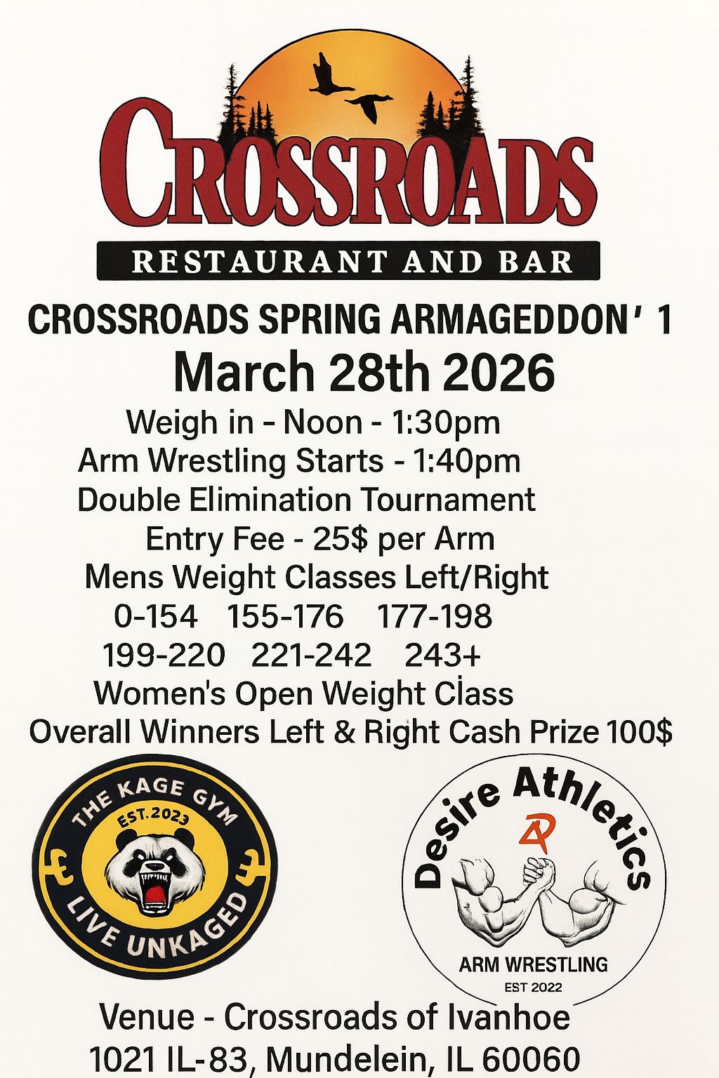 (IL) Crossroads Spring Armageddon 1 00 days 00 hours 00 minutes 00 seconds Date Mar 28 2026 Time 12:00 pm - 6:00 pm Local Time Timezone: America/Chicago Date: Mar 28 2026 Time: 12:00 pm - 6:00 pm Cost $25.00 More Info Facebook Event Page State Illinois Venue Crossroads of Ivanhoe 1021 IL-83, Mundelein, IL, 60060 Highlights Cash Event Ladies Divisions Available Facebook Event Page Share this event