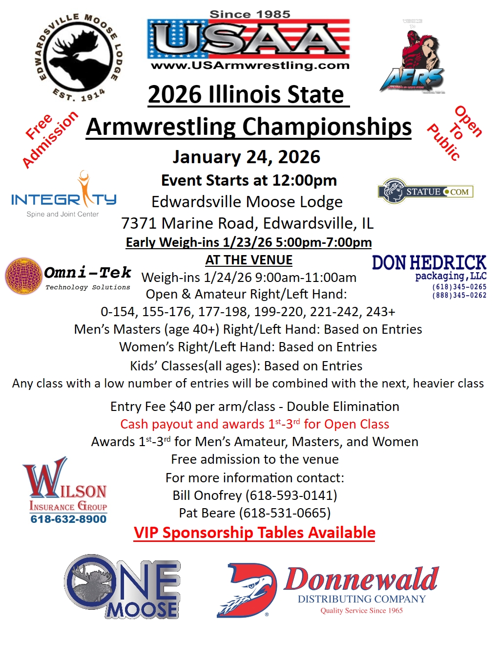 (IL) Illinois State 00 days 00 hours 00 minutes 00 seconds Date Jan 24 2026 Time 12:00 pm - 6:00 pm Local Time Timezone: America/Detroit Date: Jan 24 2026 Time: 1:00 pm - 7:00 pm State Illinois Highlights Cash Event Kids Divisions Available Ladies Divisions Available Masters Divisions Available Submits to AERS Share this event