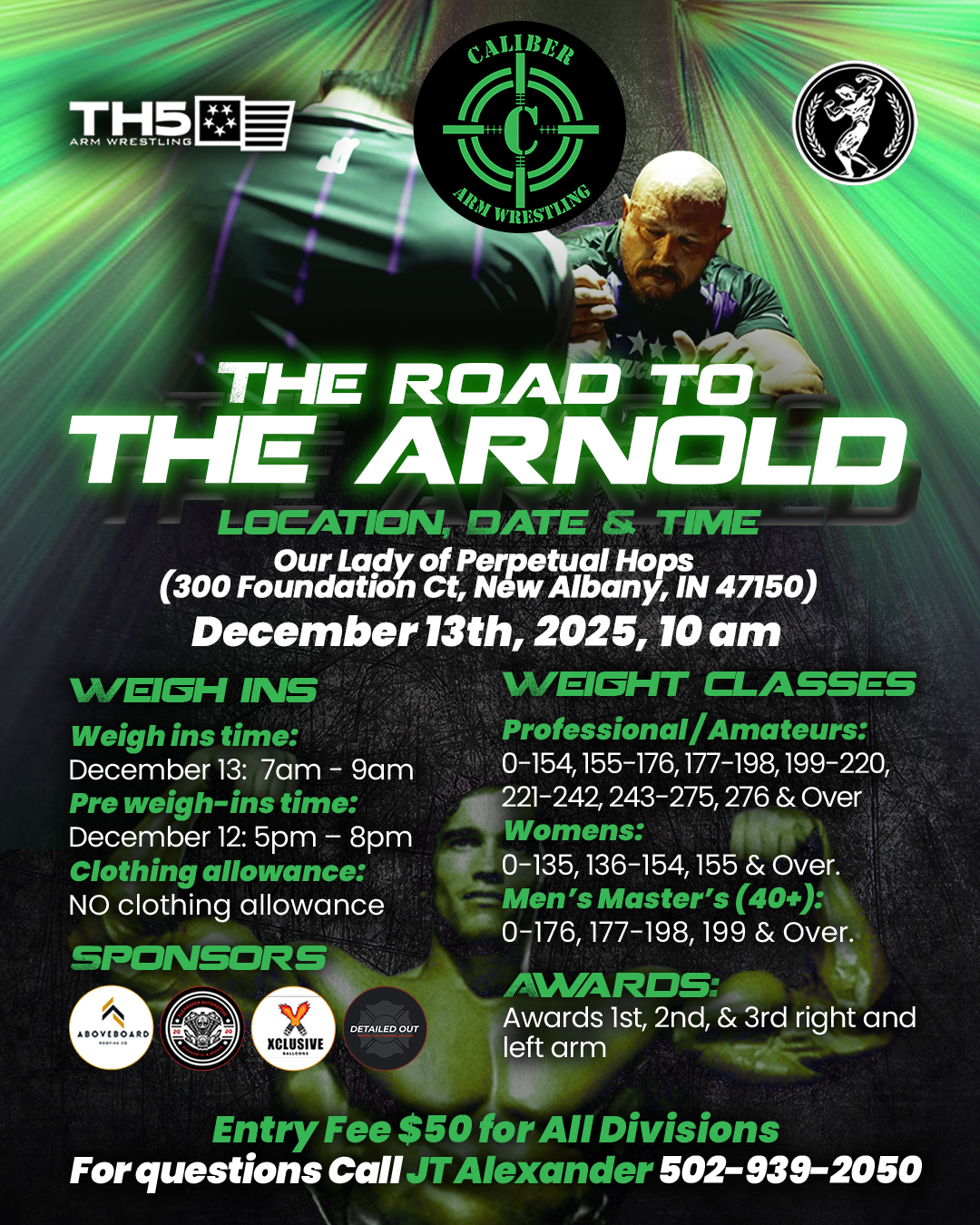 (IN) The Road to the Arnold 00 days 00 hours 00 minutes 00 seconds Date Dec 13 2025 Time 10:00 am - 4:00 pm Local Time Timezone: America/Kentucky/Louisville Date: Dec 13 2025 Time: 11:00 am - 5:00 pm Cost $50.00 State Indiana Venue Our Lady of Perpetual Hops Brewery 300 Foundation Ct., New Albany, Indiana, 47150 Highlights Ladies Divisions Available Promoter JT Alexander Phone 502-939-2050 Email alexander101595@yahoo.com Share this event