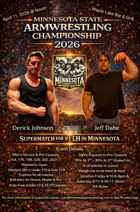 (MN) Minnesota State 00 days 00 hours 00 minutes 00 seconds Date Apr 11 2026 Time 12:00 pm - 6:00 pm Local Time Timezone: America/Denver Date: Apr 11 2026 Time: 11:00 am - 5:00 pm State Minnesota Venue Maple Lake Bar & Grill - Event Center 320 Maple Ave. N, Maple Lake, Minnesota Highlights Cash Event Ladies Divisions Available Masters Divisions Available Promoter Ryan Hoberg Email ryan@minnesotaarmwrestling.com Share this event