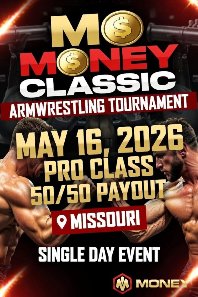 (MO) MO Money Classic 00 days 00 hours 00 minutes 00 seconds Date May 16 2026 Time 11:00 am - 6:00 pm Local Time Timezone: Europe/Paris Date: May 16 - 17 2026 Time: 6:00 pm - 1:00 am Cost $40.00 More Info Facebook Event Page State Missouri Highlights Cash Event Kids Divisions Available Ladies Divisions Available Live Broadcast Masters Divisions Available Submits to AERS Promoter Ryan Johnston Website https://www.facebook.com/KansasCityArmwrestling Facebook Event Page Share this event