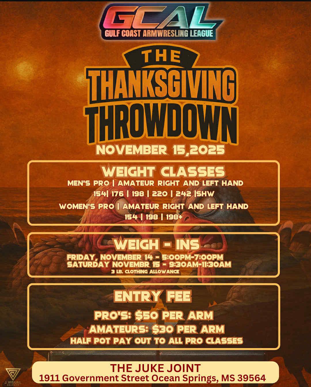 (MS) The Thanksgiving Showdown 00 days 00 hours 00 minutes 00 seconds Date Nov 15 2025 Time 12:00 pm - 6:00 pm Local Time Timezone: America/New_York Date: Nov 15 2025 Time: 1:00 pm - 7:00 pm Cost $50.00 State Mississippi Venue The Juke Joint 1911 Government Street, Ocean Springs, Mississippi, 39564 Highlights Cash Event Ladies Divisions Available Share this event