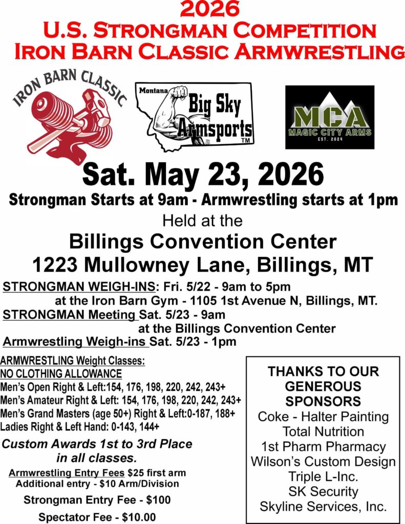 (MT) Iron Barn Classic 00 days 00 hours 00 minutes 00 seconds Date May 23 2026 Time 1:00 pm - 6:00 pm Local Time Timezone: America/New_York Date: May 23 2026 Time: 2:00 pm - 7:00 pm State Montana Venue Billings Convention Center 1223 Mullowney Lane, Billings, Montana Highlights Ladies Divisions Available Masters Divisions Available Submits to AERS Share this event