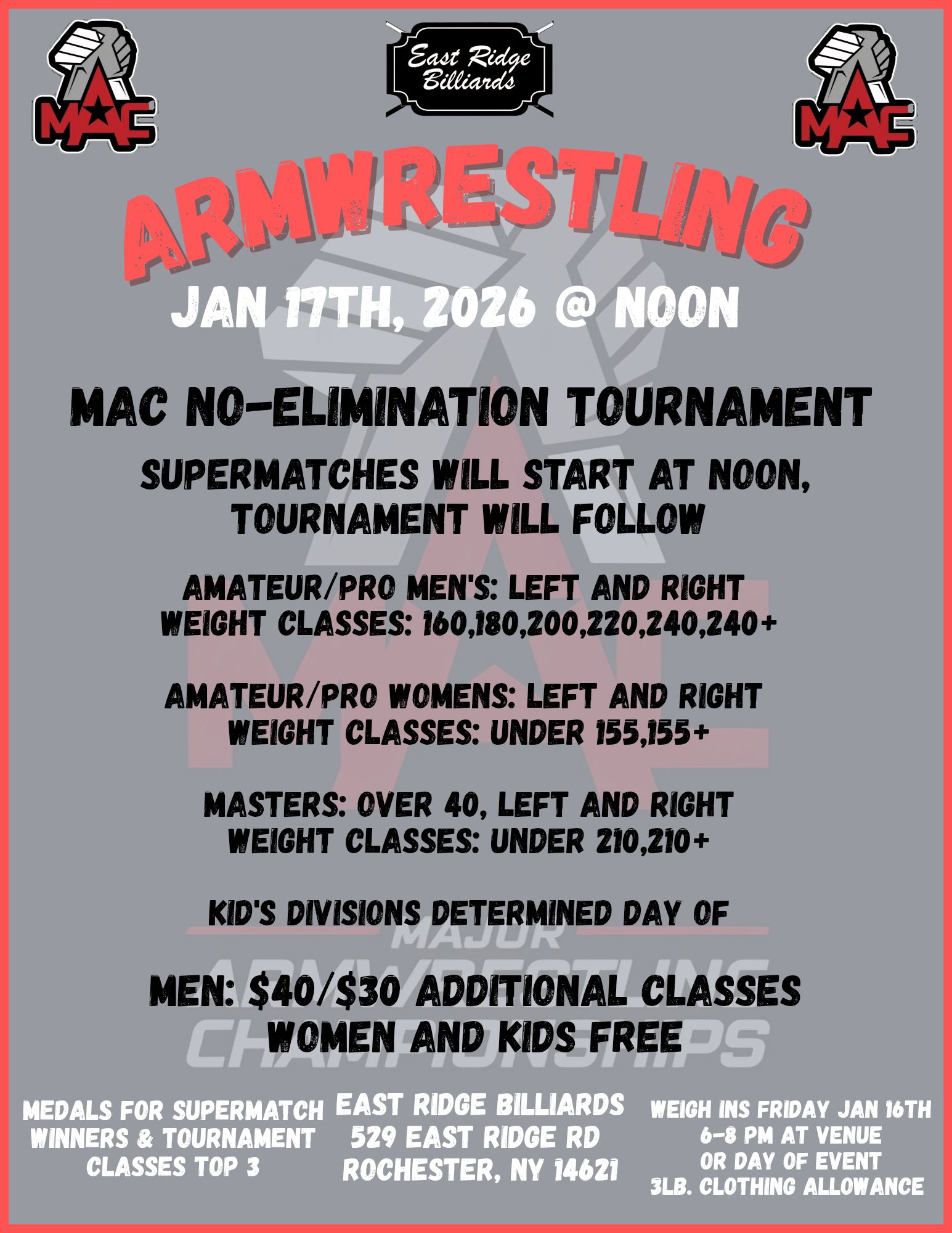 (NY) MAC Armwrestling 00 days 00 hours 00 minutes 00 seconds Date Jan 17 2026 Time 12:00 pm - 6:00 pm Local Time Timezone: America/New_York Date: Jan 17 2026 Time: 1:00 pm - 7:00 pm Cost $40.00 State New York Venue East Ridge Billiards 529 East Ridge Road, Rochester, New York, 14621 Highlights Kids Divisions Available Ladies Divisions Available Masters Divisions Available Share this event