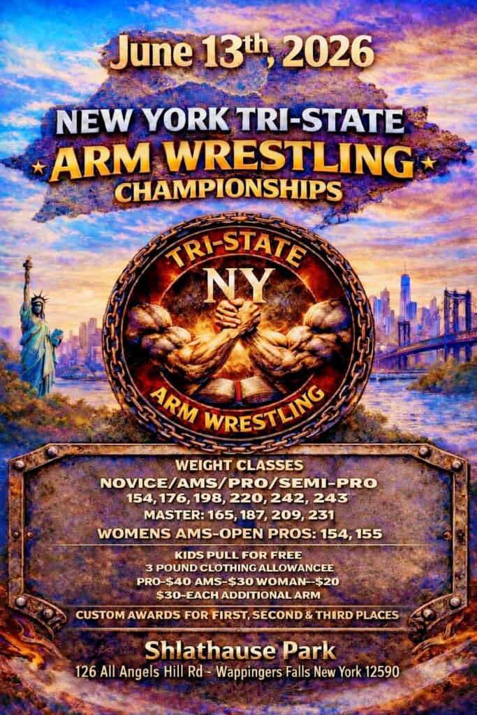 (NY) New York Tri-State Championships 00 days 00 hours 00 minutes 00 seconds Date Jun 13 2026 Time 12:00 pm - 6:00 pm Local Time Timezone: America/Chicago Date: Jun 13 2026 Time: 12:00 pm - 6:00 pm Cost $40.00 State New York Venue Shalthause Park 126 All Angels Hill Road, Wappingers Falls, New York, 12590 Highlights Kids Divisions Available Ladies Divisions Available Masters Divisions Available Promoter Steve Fernandez Phone 845-746-3663 Website https://www.facebook.com/steve.fernandez.395 Share this event