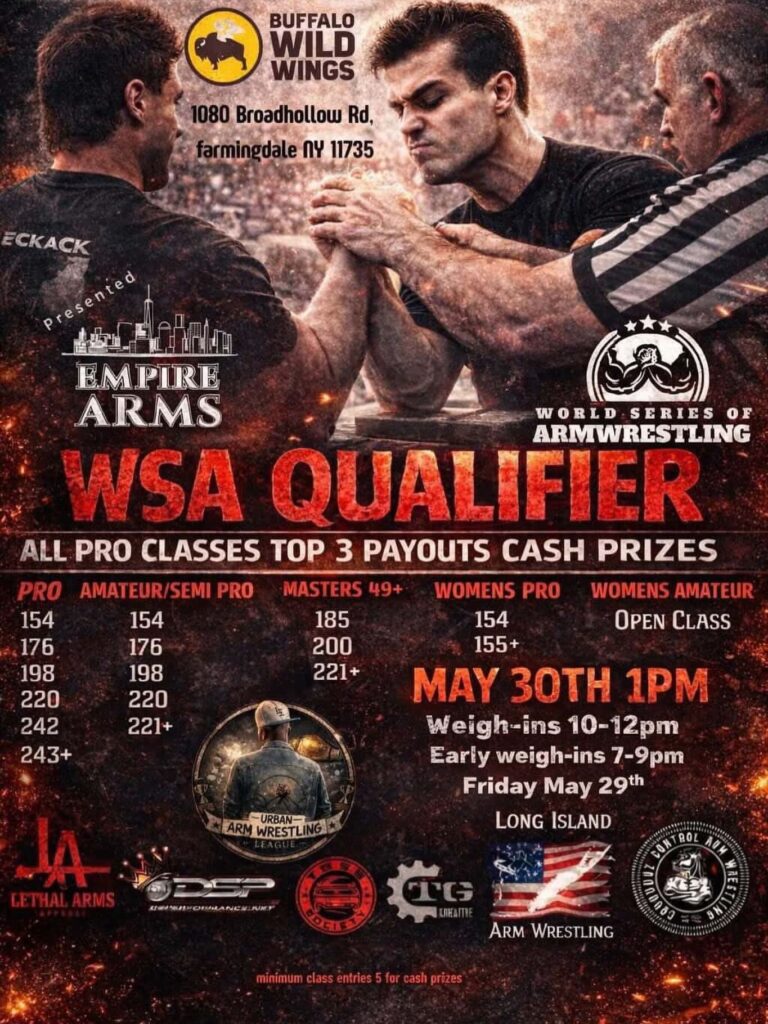 (NY) WSA Qualifier 00 days 00 hours 00 minutes 00 seconds Date May 30 2026 Time 1:00 pm - 6:00 pm Local Time Timezone: America/New_York Date: May 30 2026 Time: 2:00 pm - 7:00 pm State New York Venue Buffalo Wild Wings Farmingdale 1080 Broadhollow Rd., Farmingdale, New York, 11750 Highlights Cash Event Ladies Divisions Available Masters Divisions Available Share this event