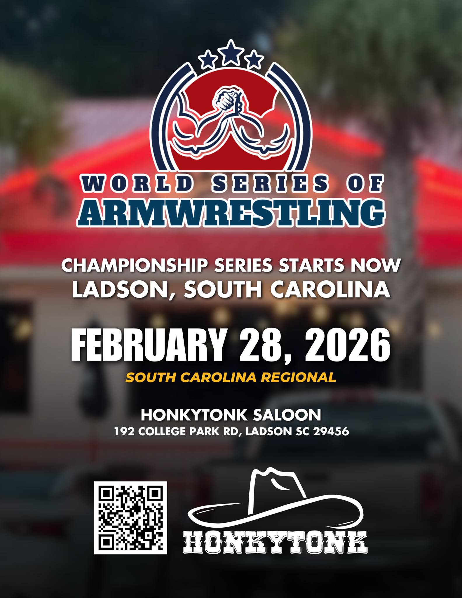 (SC) World Series of Armwrestling 00 days 00 hours 00 minutes 00 seconds Date Feb 28 2026 Time 12:00 am - 6:00 pm Local Time Timezone: America/New_York Date: Feb 28 2026 Time: 1:00 am - 7:00 pm State South Carolina Venue Honkytonk Saloon 192 College Park Road, Ladson, South Carolina, 23456 Promoter Gregg Sharp Website https://www.facebook.com/greggjsharp Share this event