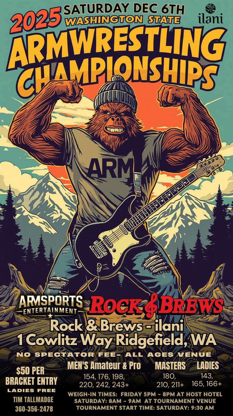 (WA) Washington State Armwrestling Championships 00 days 00 hours 00 minutes 00 seconds Date Dec 06 2025 Time 9:30 am - 2:00 pm Local Time Timezone: Australia/Sydney Date: Dec 07 2025 Time: 2:30 am - 7:00 am Cost $50.00 State Washington Venue Rock & Brews - ilani 1 Cowlitz Way, Ridgefield, Washington Highlights Ladies Divisions Available Masters Divisions Available Submits to AERS Promoter Tim Tallmadge Phone 360-356-2478 Share this event