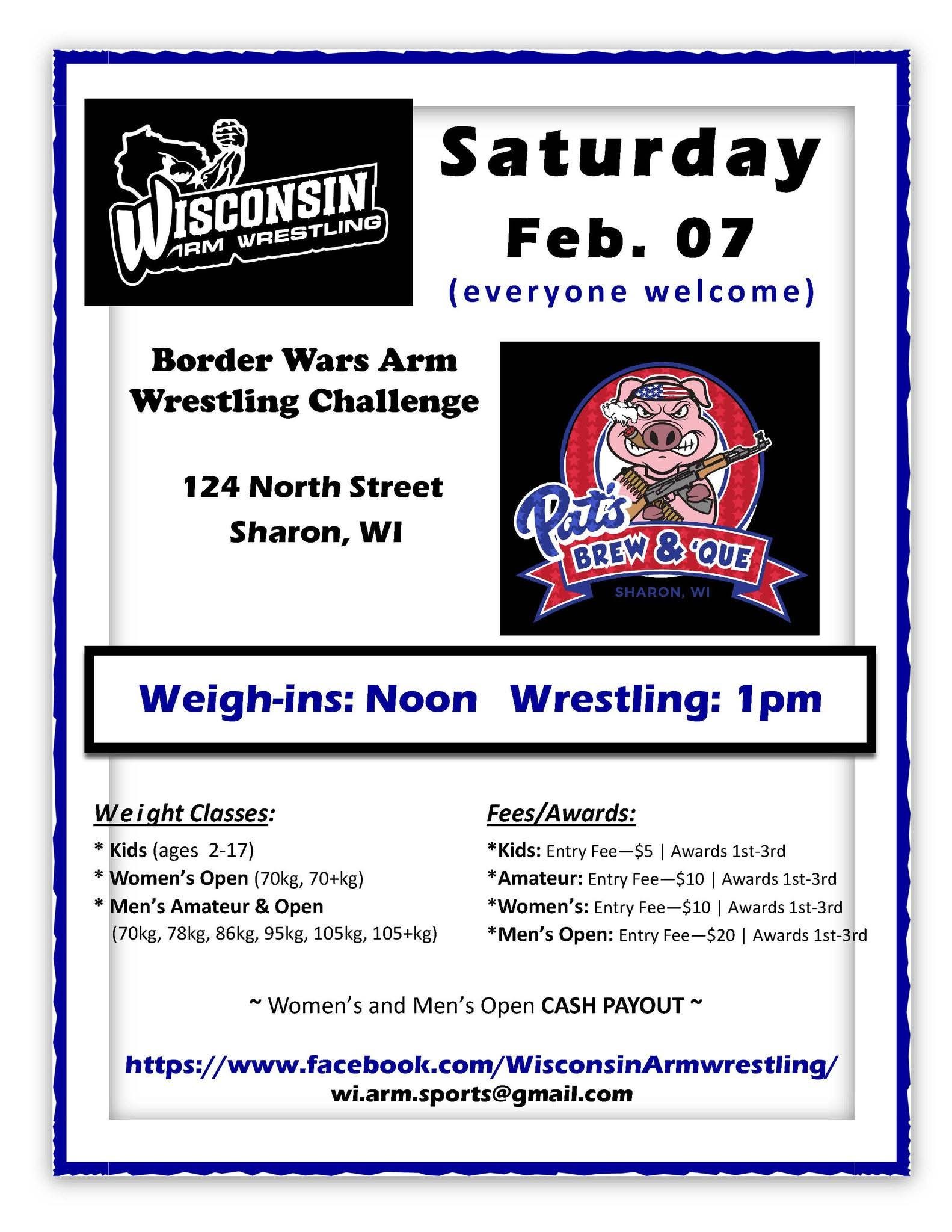 (WI) Border Wars 00 days 00 hours 00 minutes 00 seconds Date Feb 07 2026 Time 1:00 pm - 6:00 pm Local Time Timezone: America/New_York Date: Feb 07 2026 Time: 2:00 pm - 7:00 pm Cost $20.00 State Wisconsin Venue Pat's Brew & Cue 124 North Street, Sharon, Wisconsin Highlights Cash Event Kids Divisions Available Ladies Divisions Available Share this event